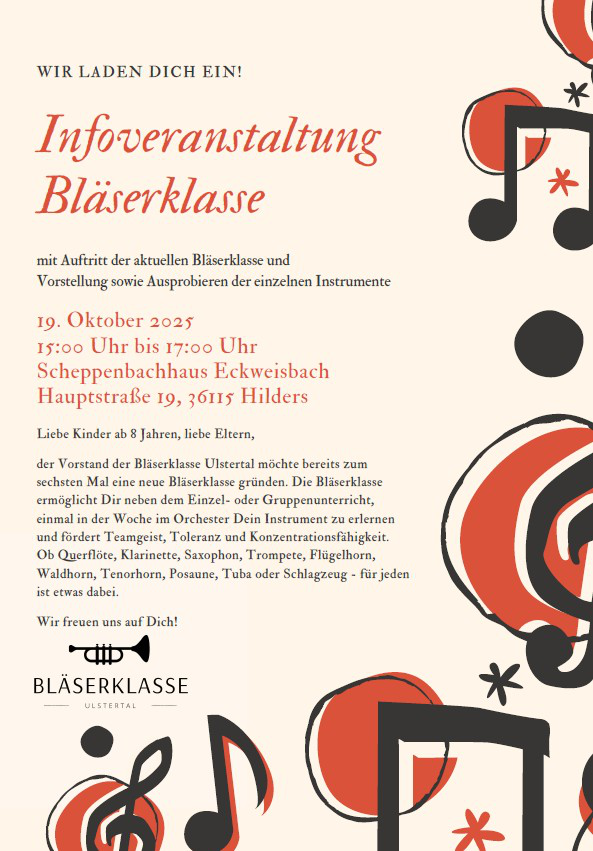 Info-Nachmittag Bläserklasse Ulstertal - 19.10.2025, ab 15:00h - Scheppenbachhaus, Hilders-Eckweisbach